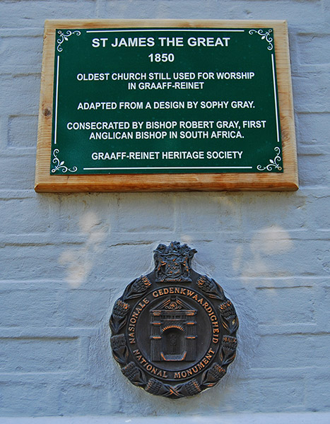 St James Anglican Church in Somerset Street was built in 1850 and consecrated by Bishop Gray, the first Anglican Bishop in South Africa, and is the oldest church still in use in Graaff-Reinet. The chancel and sanctuary were added in 1868. The Lady Chapel was added in 1893 to house the organ and the Rectory was built in 1897. The stone vestry was added in 1900.