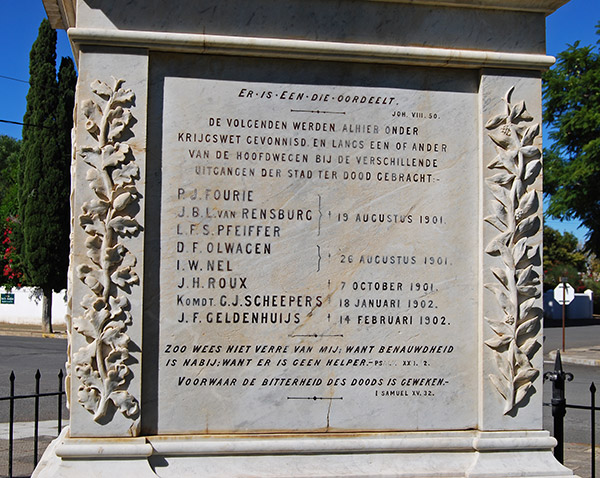 The Anglo Boer War memorial on the corner of Donkin and Somerset streets bears the Latin inscription “Dulce est pro patria mori” which translates as “Sweet is it to die for your country.” The memorial erected in 1908 commemorates the execution of eight Boer Commandos by the British for high treason and in the instance of Commandant Gideon Scheepers, for war crimes.