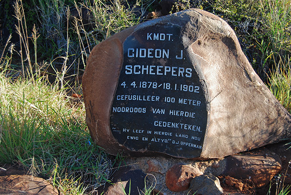 Scheepers was executed in the dry river bed of the Sundays River in an area now covered by the Nqweba Dam, the other Commandos were executed in their home districts within the Cape Colony.